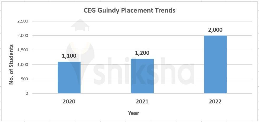 A total of 2,000+ students were placed during CEG Guindy placements 2022. Earlier, more than 1,200 and 1,100 students were placed during CEG Guindy placements 2021 and 2020, respectively.