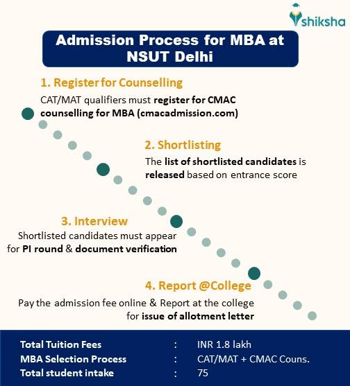 For admission in MBA/ PGDM at Netaji Subhas University of Technology (NSUT) (Formerly known as NSIT), candidate must have a valid CAT or MAT score. Without having a valid score in the aforementioned entrance examination student will not be eligible for the admission round for MBA at NSIT. The counselling process for CAT is usually concluded between August and November.