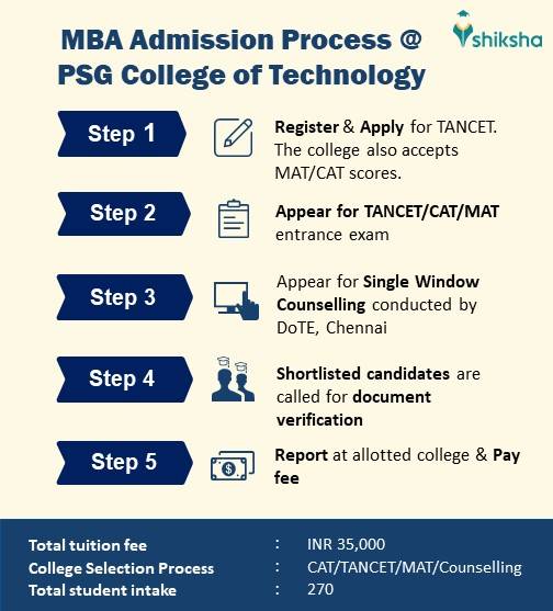 PSG College of Technology offers a two-year MBA programme across various specialisations. Admission to this course is based on the TANCET/ CAT/ MAT score followed. Eligible students seeking admission must qualify for the entrance exam for admission to this college. The total seat intake for the MBA course at PSGCT is 270. Students can check the infographic below to know the detailed MBA admission process: