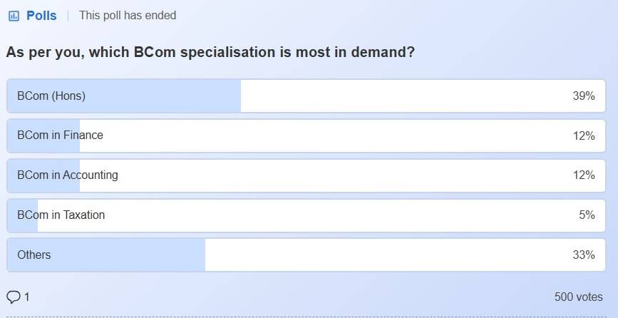 The Poll conducted by Shiksha.com makes it clear that B.Com (Hons) is the most preferred specialization with 39% votes but the distribution also shows that students are exploring new age options. Finance and Accounting continue to be strong winners with 12% each, while Taxation though it is less popular but is gaining recognition in the job market. The 33% vote share for “Others” clearly shows that students today are ready to think beyond traditional pathways and embrace specializations like Marketing, E-Commerce and International Business.