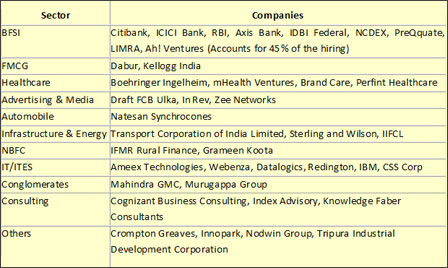 McKinsey & Company, Boston Consultancy Group, Accenture Management Consulting, A T Kearney, Deloitte, Booz & Co., Bain & Co., Siemens Management Consulting, Alvarez & Marsal, Synergy Consulting, Cairn India, Mahindra & Mahindra, Reliance Industries, Aditya Birla Group, Tata Administrative Services |