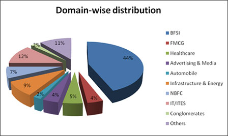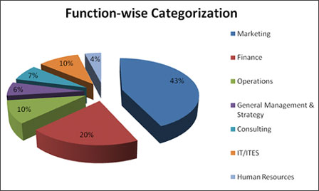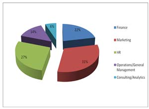 - Sector-wise break up: Breaking all the myths, 27% of the batch with an average work experience of 36 months was placed in the Marketing domain. The recruiters offered profiles spanning across marketing research, services marketing, brand strategy, sales, rural marketing, B2B marketing, advertising etc. 26% of the batch was placed in vivid and challenging profiles in Finance such as econometric modeling, investment banking, corporate finance, trading, retail banking, project finance, equity research, risk management, treasury.
