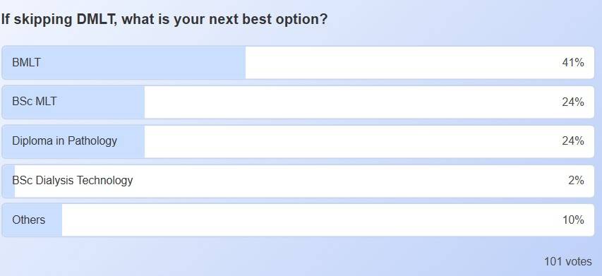 The poll with 101 votes shows that BMLT (41%) is the most preferred alternative to DMLT, reflecting students’ inclination towards degree-level qualifications for better career growth. BSc MLT (24%) and Diploma in Pathology (24%) stand as strong second options, while BSc Dialysis Technology (2%) saw minimal interest.