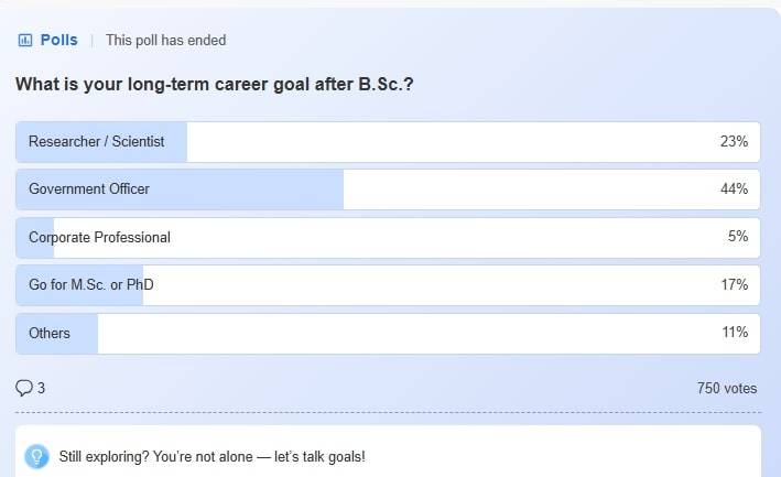 The above poll results by Shiksha.com conclude that most of our voters want a career in the government sector, followed by over 23% of voters who are willing to turn their career towards research work. then we have found that 17% of the students plan to pursue a master's degree, followed by a PhD in their chosen field of study.