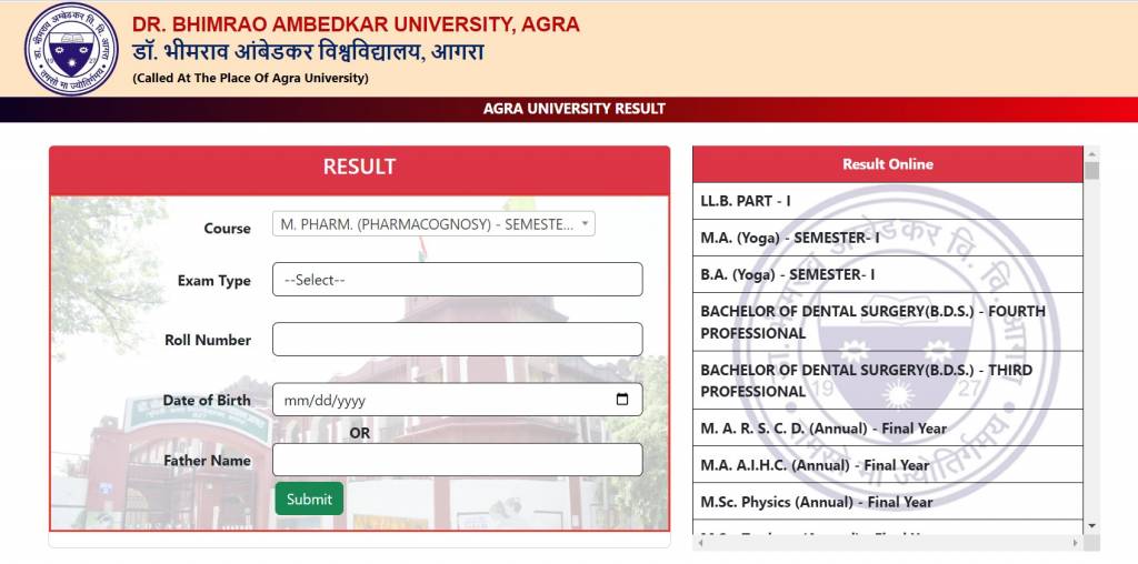 Recently, Dr Bhimrao Ambedkar University has announced semester results for various Diploma, Undergraduate and Postgraduate courses. Students who have taken the semester exam of the aforementioned courses can visit the official website of the university and click on the ‘Result’ icon on the main page, followed by clicking on the current result. Candidates are then required to select their course and enter their roll number along with their father’s name or date of birth. After that, candidates can download the scorecard displayed.