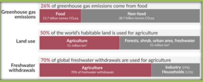 Modern food production has substantial environmental consequences. It contributes to 26% of global greenhouse gas emissions and about half of the world’s habitable land is utilized for agricultural purposes in addition to consumption of 70% of worldwide freshwater reserves (Ritchie, Roser and Rosado, 2022). Industrial farming practices are also dependent on use of chemicals such as pesticides and fertilizers which are responsible for degradation of soil quality and contributing to polluting water bodies. Animal agriculture is a contributor of 65% of world's nitrous oxide emissions which impacts 296 times more than carbon dioxide (Conzachi, 2022).
