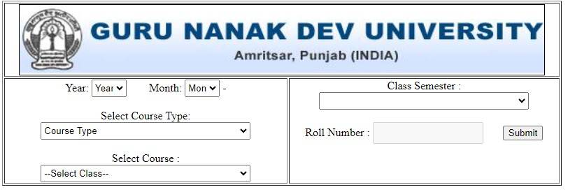 Step 5: The GNDU result 2025 window will open on the screen. Select the year, month of the examination. Now, choose the course type and semester. Enter the roll number.