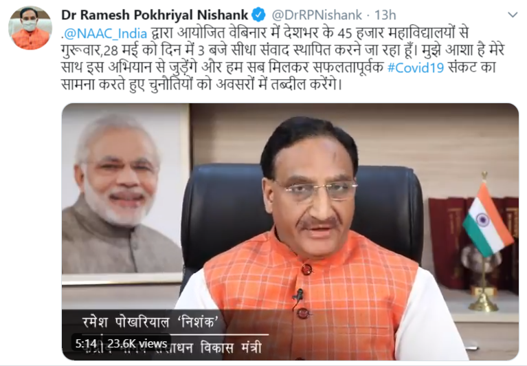 Making the announcement, Mr Pokhriyal on his official Twitter handle posted a tweet that reads“NAAC and I are going to establish a direct dialogue with 45,000 colleges across the country on Thursday, May 28 at 3 pm. I hope to join me in this campaign and we will all join together successfully COVID-19 facing a crisis, will turn challenges into opportunities.”