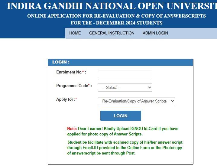 - Candidates must note that they can apply for online IGNOU re-evaluation and copy of answer scripts, once the TEE result is declared and uploaded on the IGNOU website.