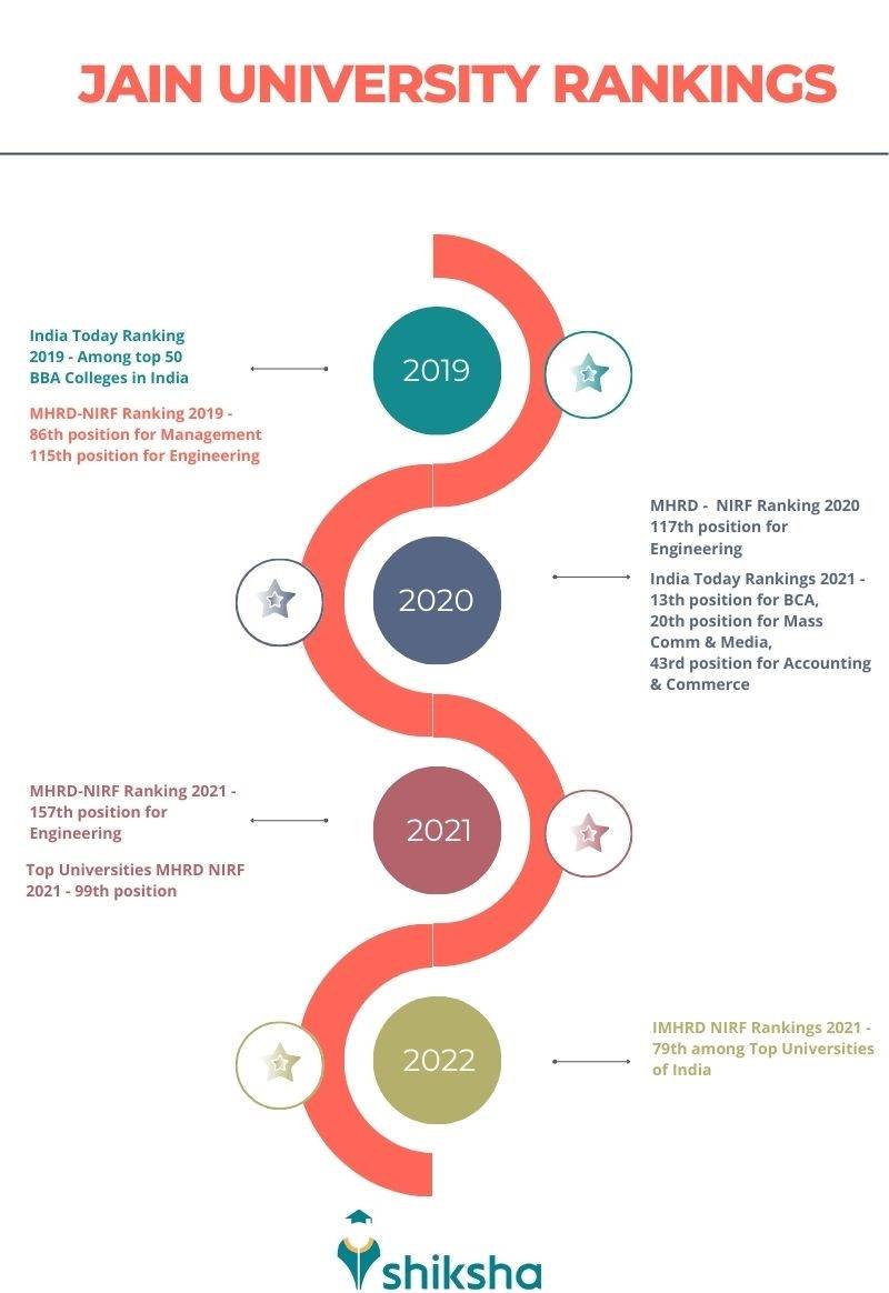 In 2021 Jain University, Bangalore was ranked 157th position, and in 2020, it was ranked at 117th position for Engineering category as per NIRF Rankings. According to India Today Rankings 2021, the university was ranked at 13th position for BCA, at 20th position for Mass Communication & Media, and at 43rd position for Accounting & Commerce streams.
