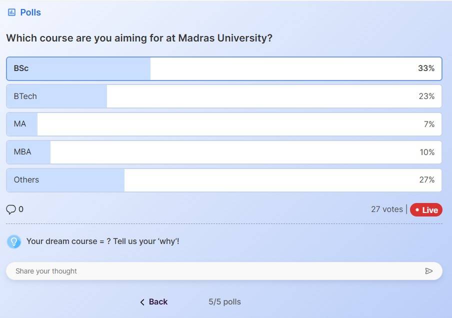 Sihksha poll revealed that BSc received the highest number of votes and was chosen as the top course students want to pursue at Madras University. The poll results point towards the growing popularity of science stream courses. Students are increasingly seeing value in traditional science degrees. Check below to view the poll results: