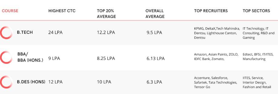 Average Package for Top 20% | INR 12.3 LPA (MBA) INR 12.2 LPA (BTech) INR 10 LPA (BBA) INR 10 LPA (BDes) |