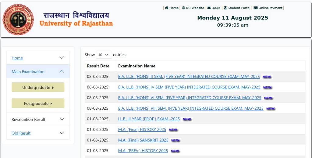 A. The latest Rajasthan University result was declared in August, 2025. UNIRAJ results 2024 and 2025 can be checked at https://result.uniraj.ac.in/. Currently, the results are out for odd semester exams and exams are ongoing for the even semesters.