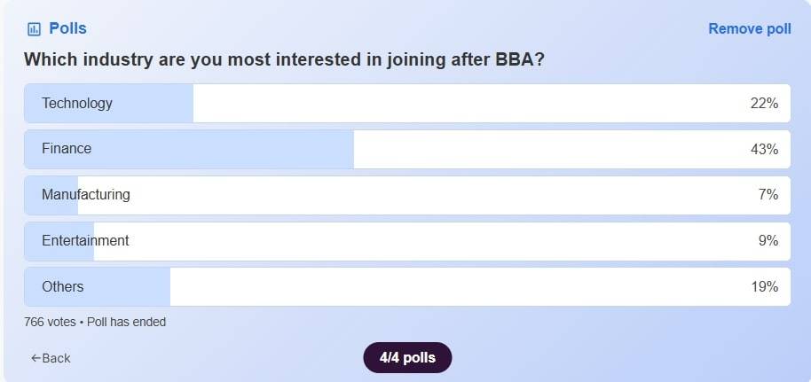 The poll reveals that 43% of BBA students aim for careers in the finance industry, which underscores the field's growing appeal among management graduates. Whether working as financial analysts, investment bankers, or wealth managers, BBA graduates are well-equipped to thrive in today's dynamic economic environment.