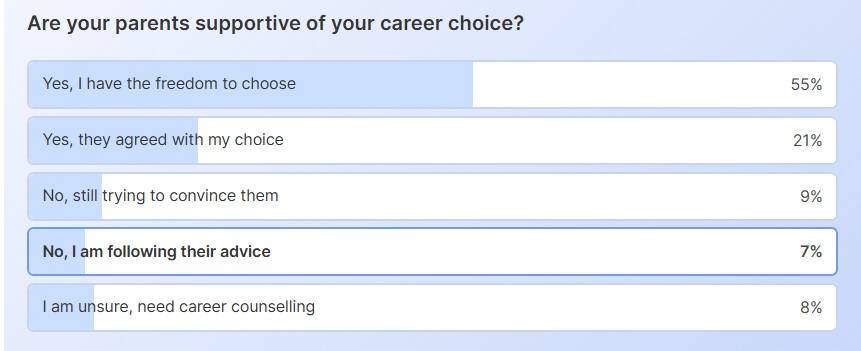 21 per cent of students shared that their parents agreed with their choice of careers. One of these respondents shared that both his parents are doctors, but he always dreamed of becoming a singer. However, even though his parents weren't very supportive of his career choice initially, later they agreed with him to join professional singing classes.