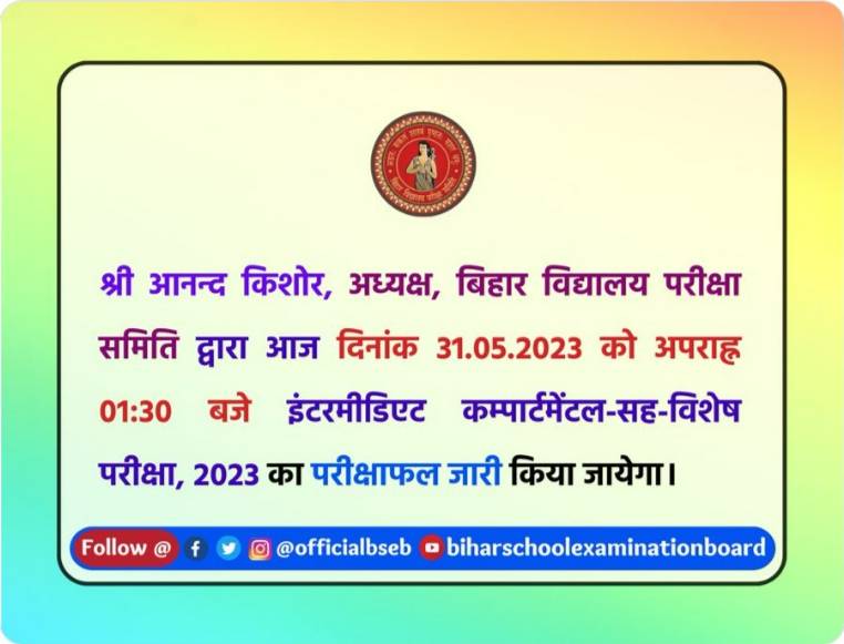 Here is the official notification for the release of the BSEB Inter Compartment Result 2023: