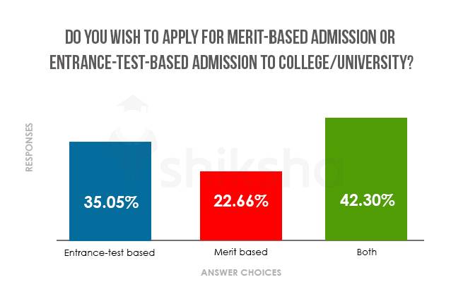 The maximum number of respondents (nearly 41 percent) choose to apply for both merit-based and entrance-test-based admissions to higher educational institutions. Nearly 36 percent will go for solely entrance-test-based admissions while the remaining 24 percent participants will choose admissions based on merit.