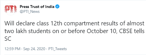 Central Board of Secondary Education (CBSE) will release the CBSE 12th Result 2020 for Compartment examination by October 10. The CBSE 12th Result 2020 will be made available on cbse.ac.in