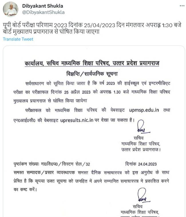 The Uttar Pradesh Madhyamik Shiksha Parishad (UPMSP) will declare the UP Board class 10 and 12 result 2023 today, April 25, 2023. Secretary of UPMSP Board informed through social media that UP Board class 10 and 12 result 2023 will be announced on April 25 at around 1:30 pm. The result can be checked online on the official websites at upmsp.edu.in and upresults.nic.in. Students need to use their roll number to check their UPMSP class 10 result 2023 and UPMSP class 12 result 2023.