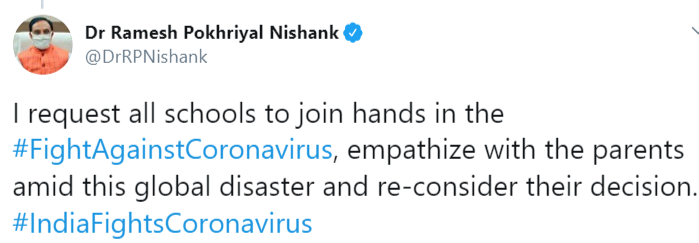 Meanwhile, social media platforms such as Twitter and Facebook are flooding with angry tweets and posts of parents who are being continuously pressurized by schools for fees. Some schools are even threatening the parents to cancel their ward’s admission.
