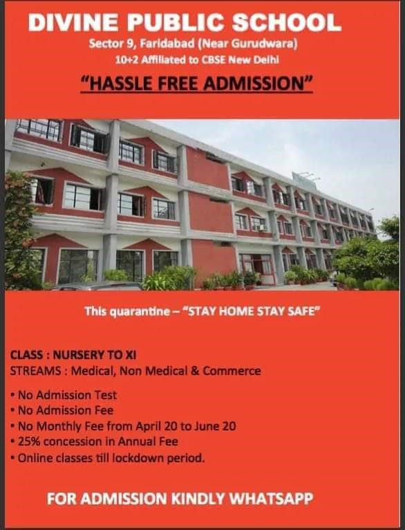 Adhering to the orders of the central and state government, Divine Public School, Faridabad came out as great support for parents who are worried about their ward’s school admission. Due to the lockdown period, the school not only waived off admission fees and admission tests but is also giving 25 per cent concession in the annual fees. Also, the school is not charging any monthly fee from April 20 to June 20.