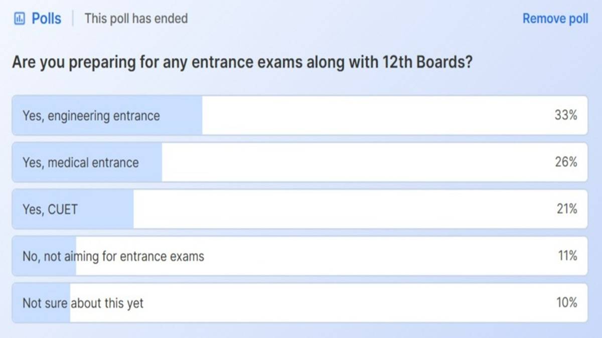 The poll clearly shows that a large share of Class 12 students are not restricting themselves to board exam preparation. Instead, they are aiming for multiple goals, strong board marks as well as success in competitive exams that open doors to engineering, medicine, and other undergraduate programs.