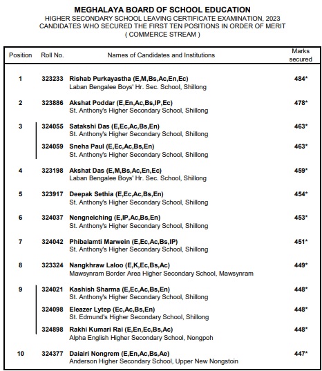 - Meghalaya Board HSSLC Topper List 2023 Commerce