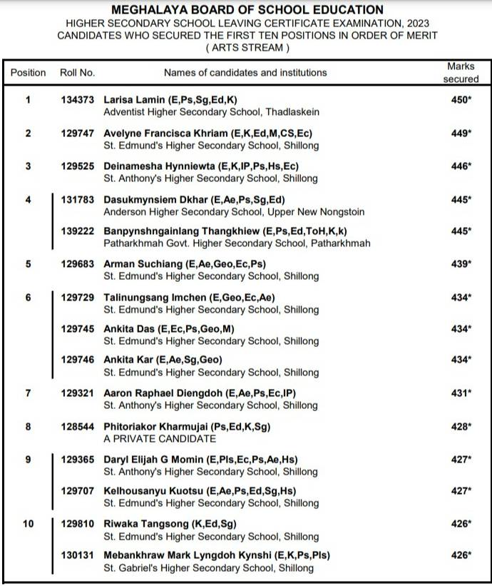 - Meghalaya Board HSSLC Topper List 2023 Arts
