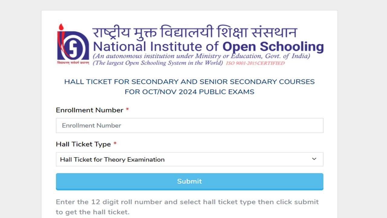To check and download NIOS Admit Card 2024, students are required to enter credentials such as enrollment number and select Class to download the NIOS 2024 October session admit card.
