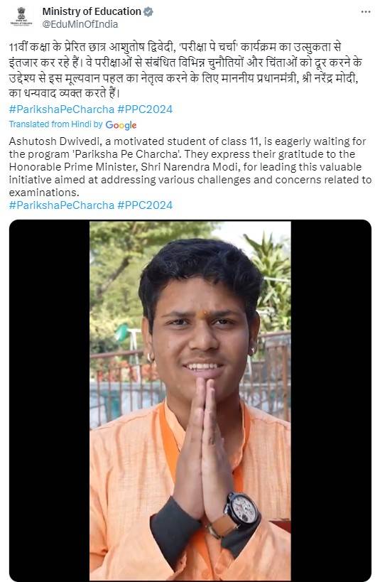 Ashutosh Dwivedi, a motivated student of Class 11, is eagerly waiting for the program 'Pariksha Pe Charcha'. They express their gratitude to the Honorable Prime Minister, Shri Narendra Modi, for leading this valuable initiative aimed at addressing various challenges and concerns related to examinations. "Exam days often make students anxious. We as children many times find it difficult to talk to our parents. But when our PM Modi interact with us ahead of board exam, it resolves our issues and help us stay confident during exams," said Dwivedi.Â