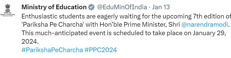 The MoE will conduct the seventh season of Pariksha Pe Charcha 2024 on January 29 from 11 am onwards at Bharat Mandapam in New Delhi's Pragati Maidan. Announcing PPC 2024 Date, the Ministry through its official social media handle on X stated, “Enthusiastic students are eagerly waiting for the upcoming 7th edition of 'Pariksha Pe Charcha' with Hon’ble Prime Minister, Shri Narendra Modi. This much-anticipated event is scheduled to take place on January 29, 2024.”
