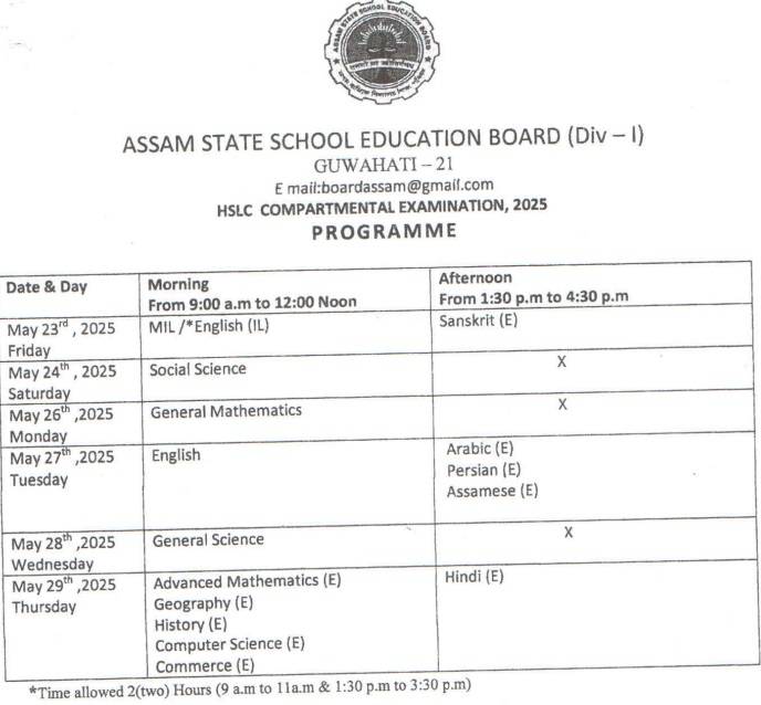 SEBA will announce the Assam HSLC compartment exam date 2026 after the final exam result. Until then, they can check last year's Assam Board HSLC compartment routine 2025 below: