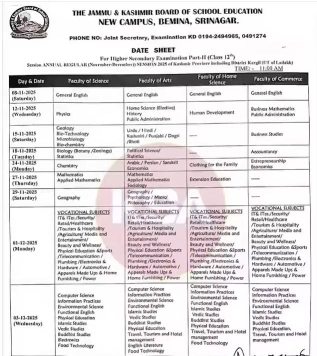- JKBOSE 12th Date Sheet 2025 for Nov-Dec Session of Kashmir Province including Kargil
