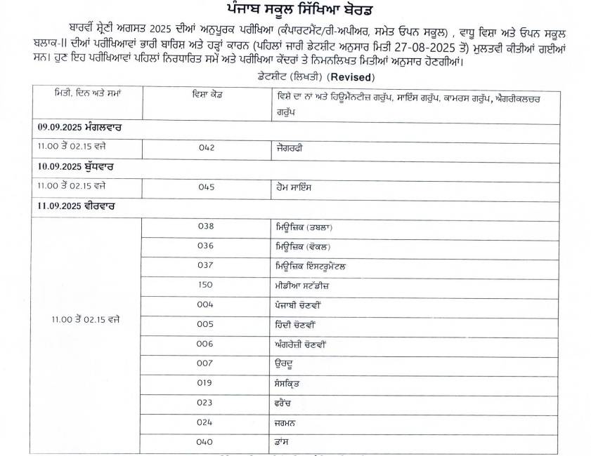 Students can check the Revised PSEB 10th Compartment Date Sheet 2025 below.