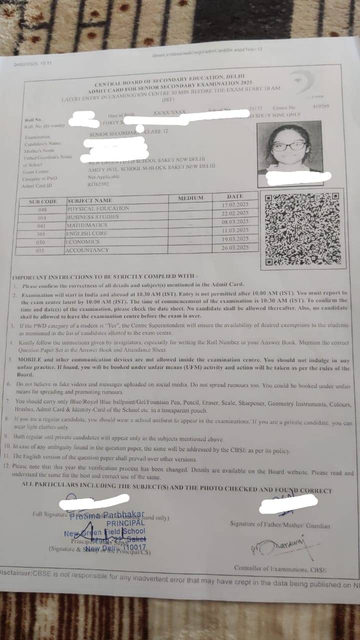 - The students and the Mother/Father/Guardian must check the photograph and all particulars mentioned in the admit card and sign at the appropriate plate after verifying its correctness