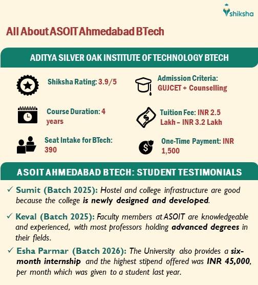Aditya Silver Oak Institute of Technology BTech course through its various departments. The undergraduate-level course is available in a full-time mode lasting for four academic years. Further, the engineering course is available in various specialisations, including Civil Engineering, Aeronautical Engineering, Chemical Engineering, and Computer Engineering, among others. Find below the ASOIT BTech infographics 2025: