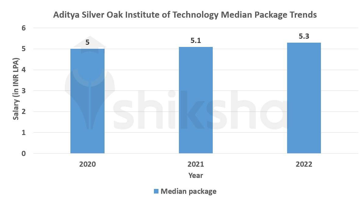 Further, Aditya Silver Oak Institute of Technology average package trend will be covered as and when released. For now, have a look at the median package to get an estimate. The median package offered to BTech students has constantly risen since 2020. From INR 5 LPA in 2020 and INR 5.1 LPA in 2021, the median salary reached INR 5.3 LPA in 2022. For more clarity, check out the graph below: