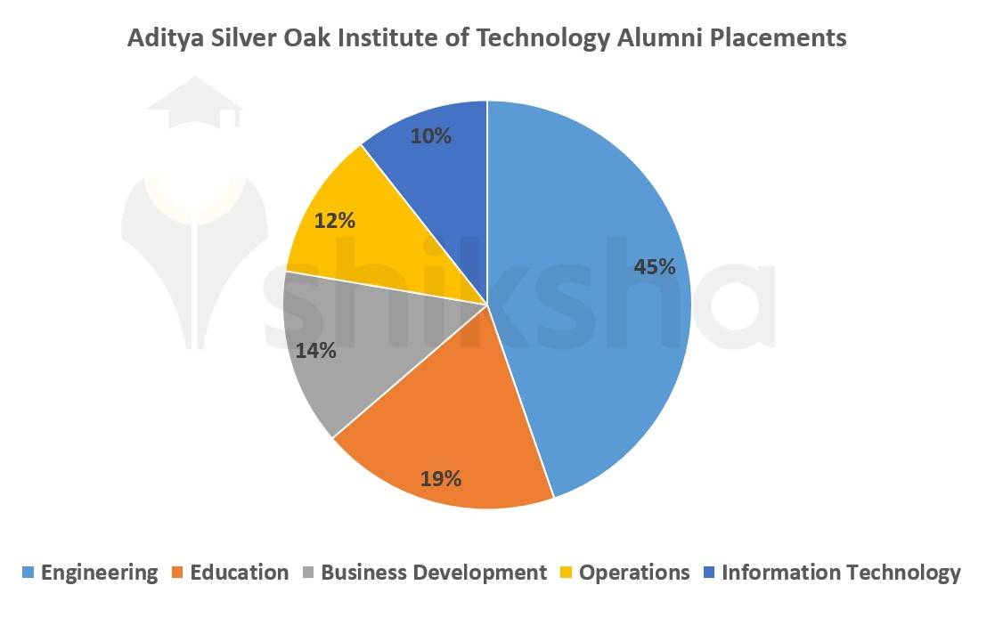 As per the external sources, a major portion of Aditya Silver Oak Institute of Technology alumni are placed in the Engineering sector (45%), followed by the Education (19%) and Business Development (14%) sectors. The pie chart below shows a sector-wise bifurcation of Aditya Silver Oak Institute of Technology alumni placements throughout the years: