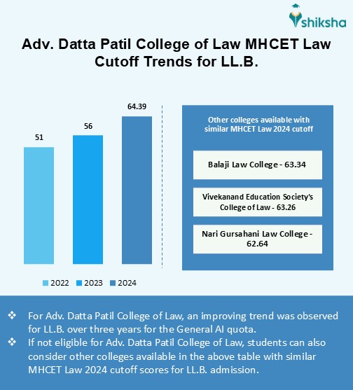 Combined intake across all courses at Adv. Datta Patil College of Law is up to 120. Adv. Datta Patil College of Law offers Degree courses including 2 UG course. These programs are offerred in Full Time mode.