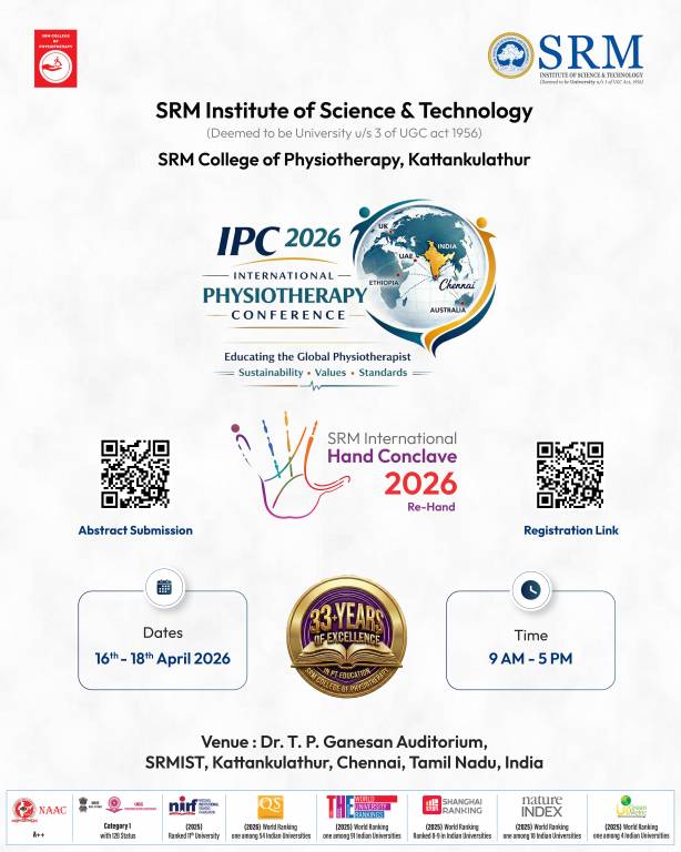 The SRM College of Physiotherapy, SRMIST, will host the International Physiotherapy Conference 2026 (IPC 2026) from April 16 to 18, 2026, at its Kattankulathur campus. This will be a major event for academics, which will bring together more than 3,000 healthcare experts from all over the world.