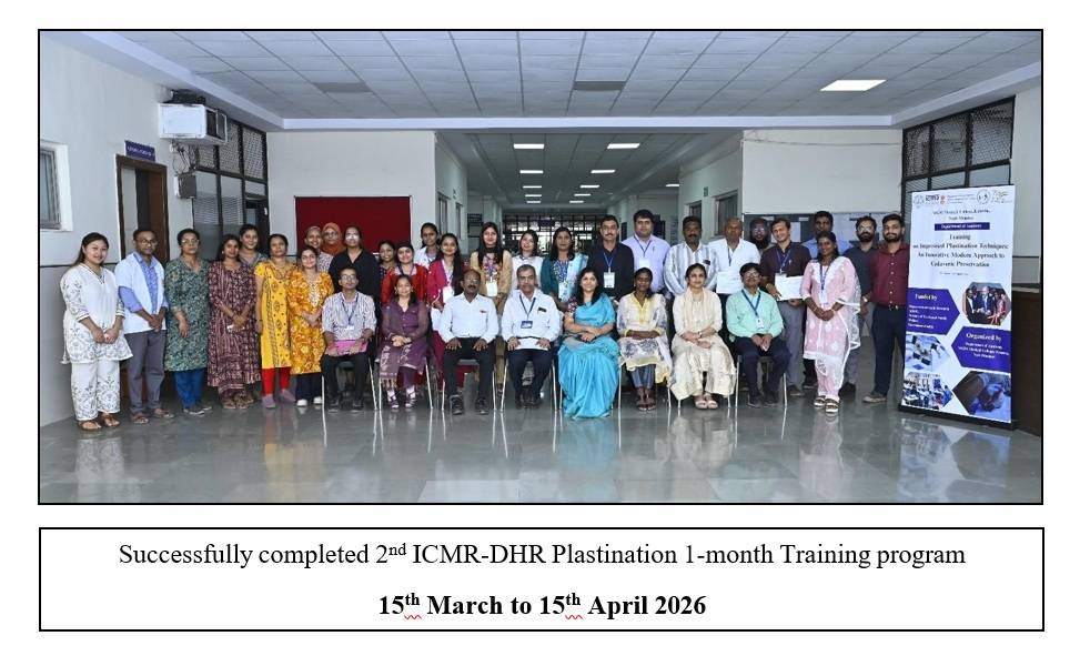The 1st batch of the ICMR Plastination Training Program was conducted from 1st to 31st March 2025, and the 2nd batch from 15th March to 15th April 2026. A total of 15 delegates from various medical and allied health institutions were successfully trained in the innovative field of cadaveric preservation.