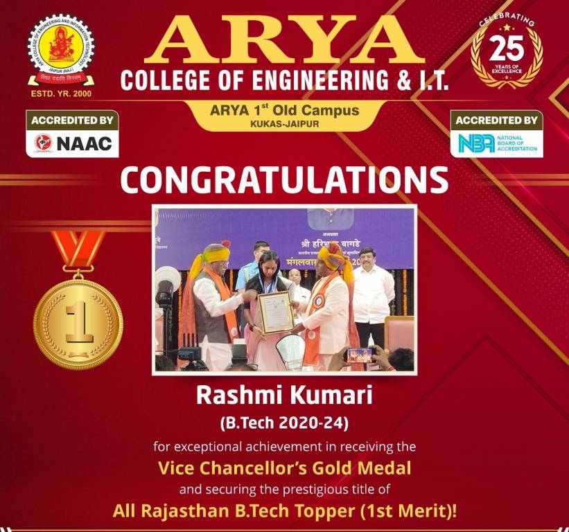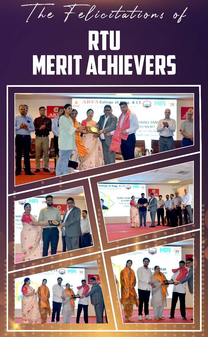 April 23, 2025: Arya College of Engineering & IT, Jaipur proudly felicitated the merit holders during the grand Victory 2025 - Academic Prize Distribution Ceremony held on 11th April 2025. A key highlight of the event was the recognition of 15 outstanding students from B.Tech & MBA who secured the highest merit positions in Rajasthan in the prestigious RTU Merit List for the session 2020-24. These students were honored with mementos and certificates as a mark of their dedication, hard work, and exceptional academic performance. Their success stands as an inspiration for the entire student community and a testament to Arya College’s commitment to academic excellence.