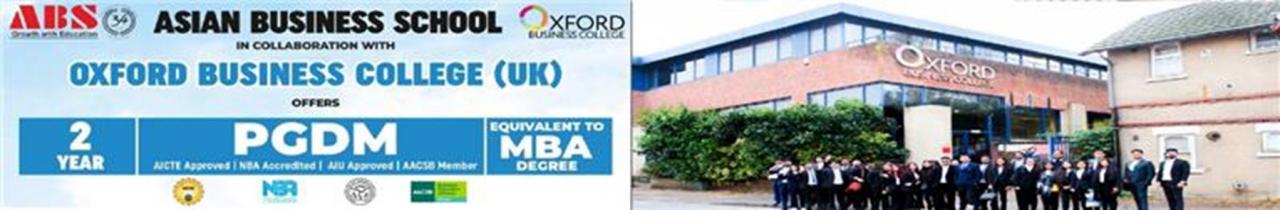 Asian Business School offers postgraduate courses to students. These courses are provided across the Managment and various other streams. At the PG level, the college offers a two-year PGDM with a one-week Residential Learning Trip to Oxford, London / (U.K.). Asian Business School is accredited by the NBA and approved by AICTE. The college's PGDM course has been granted equivalence to the MBA degree from the AIU. The college even offers an Executive Certification Programme in Digital Marketing from NIIT.