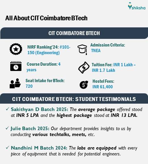 The below mentioned infographic contains more information about the CIT Coimbatore BTech programme including fees, reviews, seats, and more: