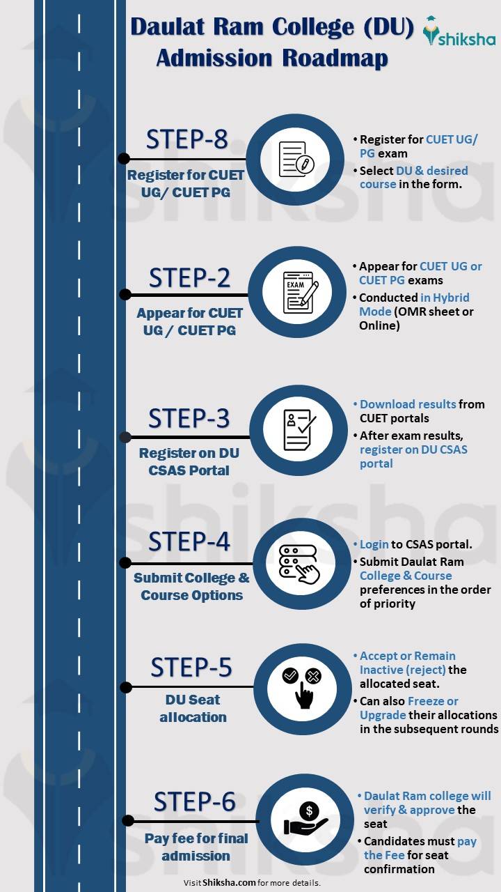 Delhi University for all its affiliated colleges, such as Daulat Ram College started considering CUET UG exam for admission to its UG courses. For postgraduate courses, DU-affiliated colleges will be considering CUET PG conducted by NTA . Daulat Ram College admission process for UG or PG courses consists of six major steps which include registration for CUET UG or PG, appearance in the relevant exam, registration for DU CSAS, CSAS counselling process, merit list release and seat allocation.