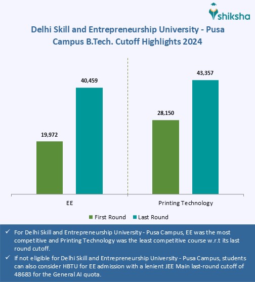 The minimum rank needed for General Home State category candidates for the BTech courses with a medium profile of academics is 100000. DESU JAC Delhi cutoff 2024 ranged from 116042 to 146482 for the General Home State category candidates. Delhi Skill and Entreprenuership University releases JAC Delh