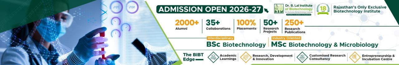 BIBT Jaipur admissions are merit-based. The college offers courses at UG and PG level in Biotechnology and Microbiology under the affiliation of the University of Rajasthan. Candidates need to fill out the application form online on the institute's official website for admission to Dr B Lal Institute of Biotechnology.