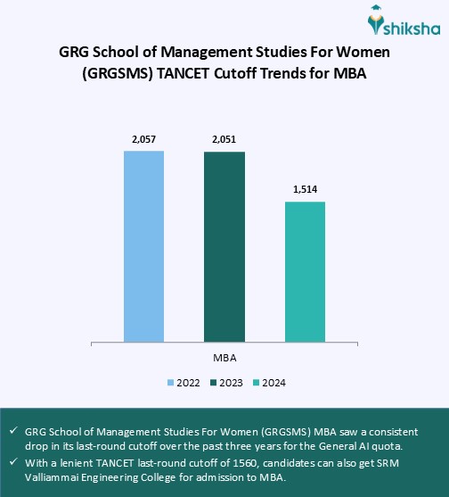 The TANCET score cutoff for the Master of Business Administration (MBA) programme at GRG School of Management Studies For Women (GRGSMS) in Coimbatore was 2057 in 2022 and 1514 in 2024.