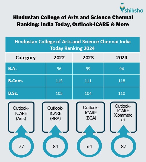 It is to be noticed that the institute has shown stability in trend in the 'BBA' category as compared to the ranking of preceding years. In 2024, Hindustan College of Arts and Science Chennai's rank is #84, the same as last year's rank in the 'BBA' category by the Outlook-ICARE ranking.