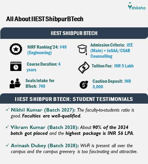 IIEST Shibpur BTech is a four-year full-time programme in nine disciplines. Admission to BTech programme at Institute of Engineering Science and Technology, Shibpur is done basis JEE Main score followed by JoSAA / CSAB Counselling. Check out the following infographic to learn more about the IIEST Shibpur BTech programme: